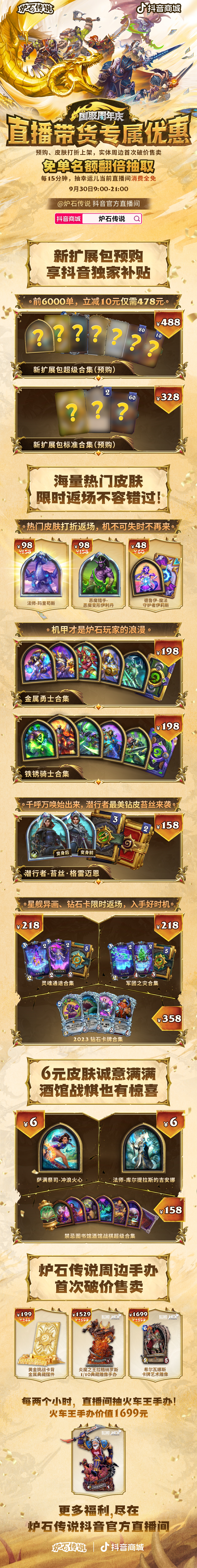 新扩展包预购专属优惠来袭,玛里苟斯等酷炫皮肤和异画限时返场。每十五分钟直播间抽消费全免,更有火车王手办等你来抽。更多专属优惠尽在《炉石传说》抖音直播间。