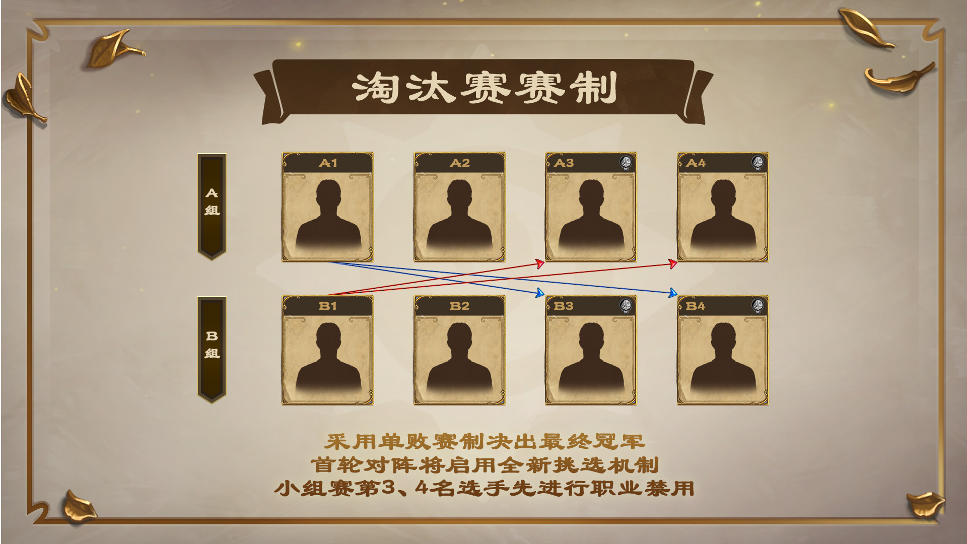 - 首轮对阵开始前,由小组赛第3、4名选手先进行职业禁用