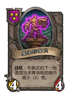 - 4/4。战吼:你购买的下一张酒馆法术牌消耗的铸币减少(2)枚。