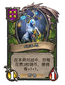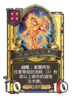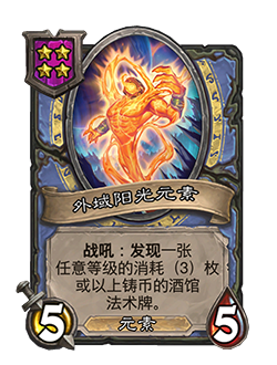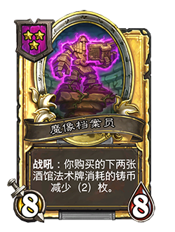 - 5/5。战吼:发现一张任意等级的消耗(3)枚或以上铸币的酒馆法术牌。