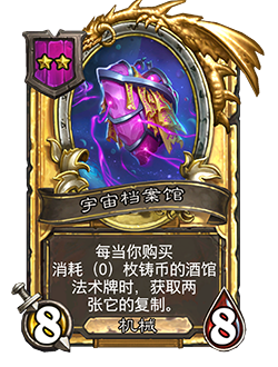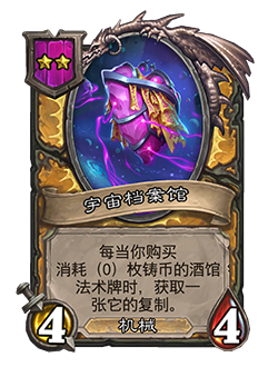 - 4/4。每当你购买消耗(0)枚铸币的酒馆法术牌时,获取一张它的复制。