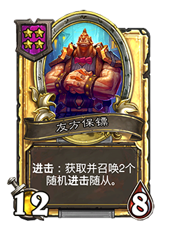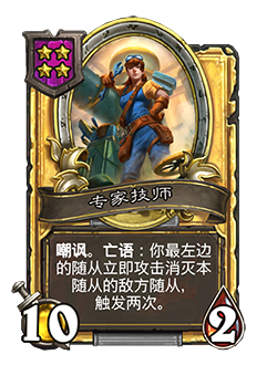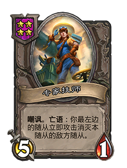 - 5/1。嘲讽。亡语:你最左边的随从立即攻击消灭本随从的敌方随从。