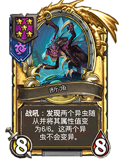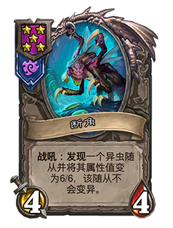 - 4/4。战吼:发现一个异虫随从并将其属性值变为6/6,该随从不会变异。