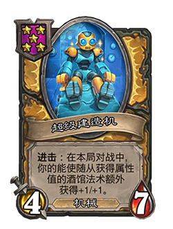 - 4/7。进击:在本局对战中,你的能使随从获得属性值的酒馆法术额外获得+1/+1。
