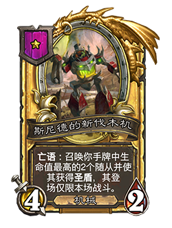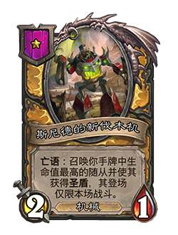 - 改动后:斯尼德的新伐木机:亡语:召唤你手牌中生命值最高的随从并使其获得圣盾,其登场仅限本场战斗。
