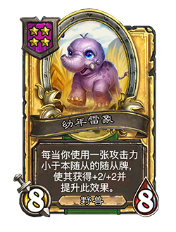 - 改动前:[等级3]每当你使用一张攻击力小于本随从的随从牌,使其获得+2/+2并提升此效果。