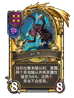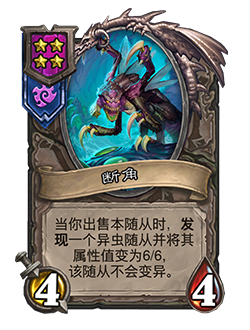 - 改动后:[等级4]当你出售本随从时,发现一个异虫随从并将其属性值变为6/6,该随从不会变异。
