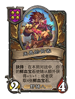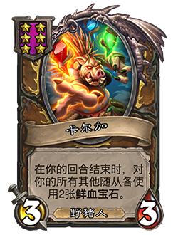- 改动后:3/3。在你的回合结束时,对你的所有其他随从各使用2张鲜血宝石。