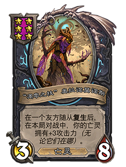 - 改动后:在一个友方随从复生后,在本局对战中,你的亡灵拥有+3攻击力(无论它们在哪)。