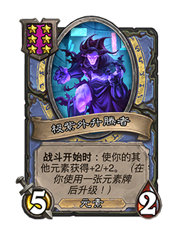 - 改动后:5/2。战斗开始时:使你的其他元素获得+2/+2。(在你使用一张元素牌后升级!)