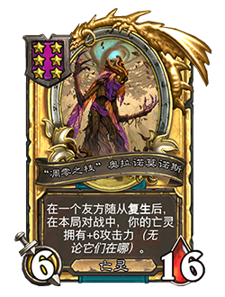 - 改动前:在一个友方随从复生后,在本局对战中,你的亡灵拥有+2攻击力(无论它们在哪)。