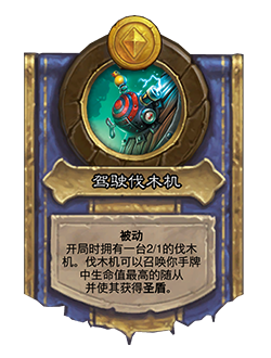 - 改动前:驾驶伐木机[被动]:开局时拥有一台2/1的可以召唤你手牌中生命值最高的随从的伐木机。