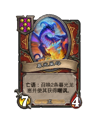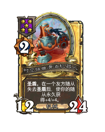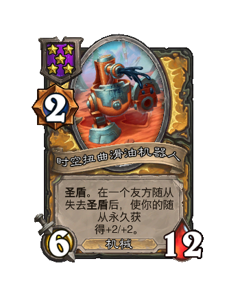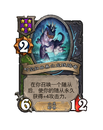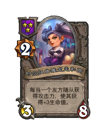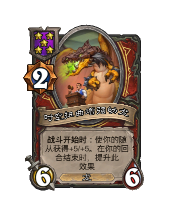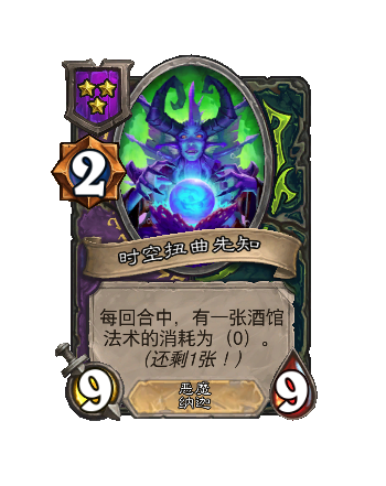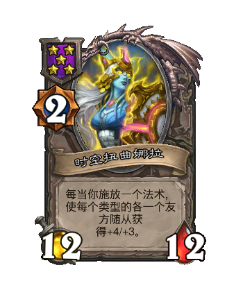 - 改动前:5/4。每当你施放一个酒馆法术,随机使三个友方随从获得+2/+2。
