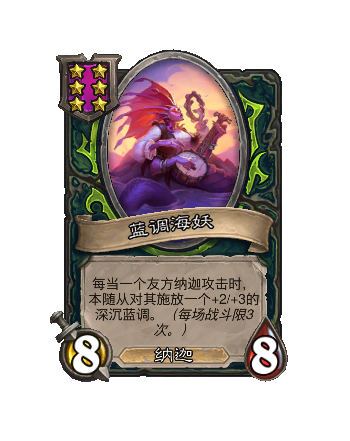 - 改动前:每当一个友方纳迦攻击时,对其施放一个+2/+3的深沉蓝调。(每场战斗限3次。)