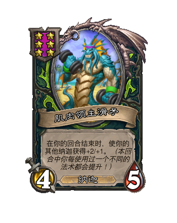 - 改动前:4/6。在你的回合结束时,使你的其他纳迦获得+1/+1。(本回合中你每使用过一个不同的法术都会提升!)