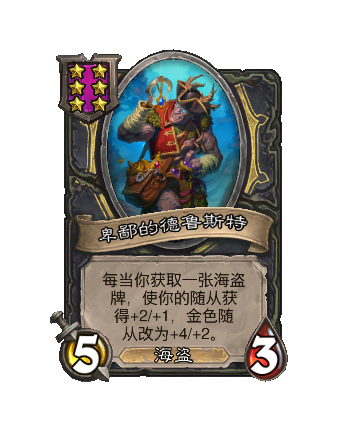 - 改动后:5/3。每当你获取一张海盗牌,使你的其他随从获得+2/+1,金色随从改为+4/+2。