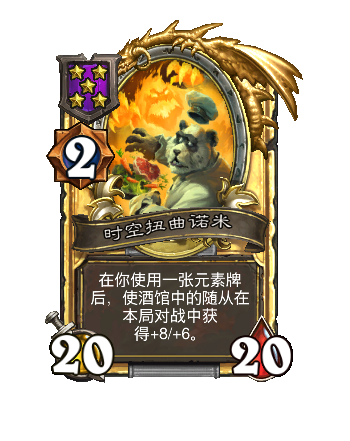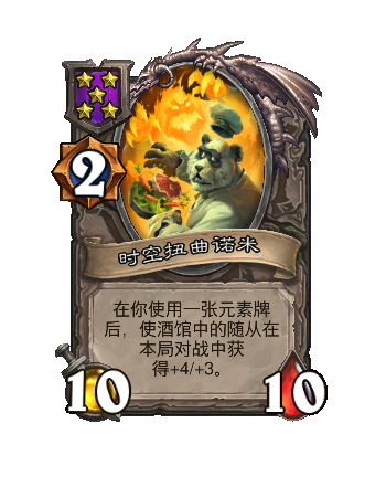 - 改动后:在你使用一张元素牌后,使酒馆中的随从在本局对战中获得+4/+3。