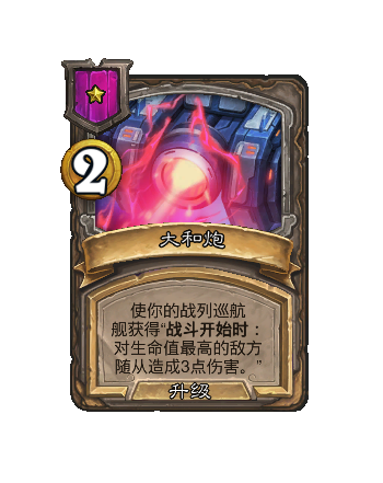 - 改动后:使你的战列巡航舰获得“战斗开始时:对生命值最高的敌方随从造成3/6/9/18/24/30/40点伤害。”