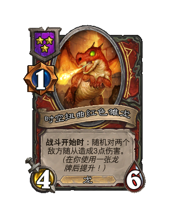 - 改动后:战斗开始时:随机对两个敌方随从造成3点伤害。(在你使用一张龙牌后提升!)