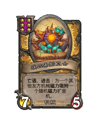 - 改动后:7/5。亡语,进击:为一个其他友方机械磁力吸附一个随机磁力扩音机。