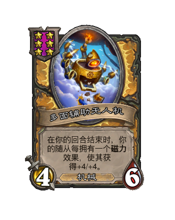 - 改动后:4/6。在你的回合结束时,你的随从每拥有一个磁力效果,使其获得+4/+4。