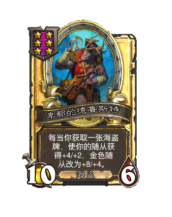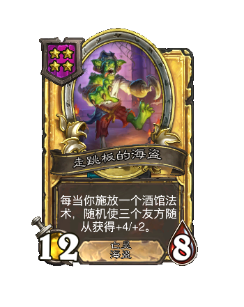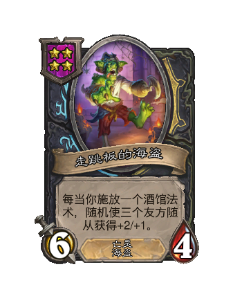 - 改动前:6/4。每当你获取一张海盗牌,使你的其他随从获得+1/+1,金色随从改为+2/+2。