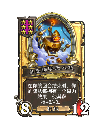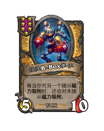 - 改动前:5/7。在你的回合结束时,你的随从每拥有一个磁力效果,使其获得+3/+3。