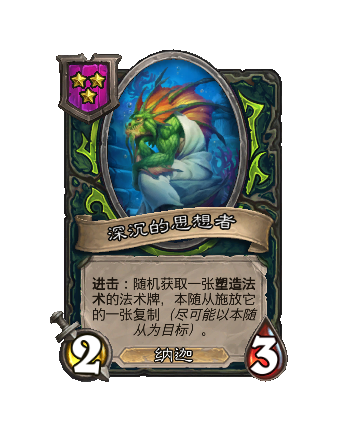 - 改动后:2/3。进击:随机获取一张塑造法术的法术牌。本随从施放它的一张复制(尽可能以本随从为目标)。