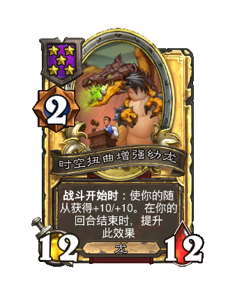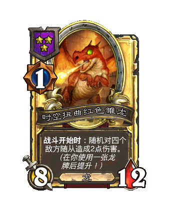 - 改动前:战斗开始时:随机对两个敌方随从造成2点伤害。(在你使用一张龙牌后提升!)