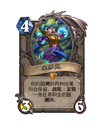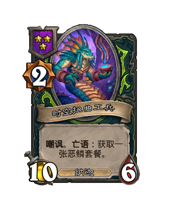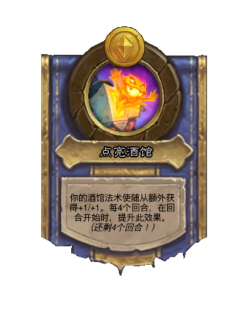 - 改动后:6/4。每当你施放一个酒馆法术,随机使三个友方随从获得+2/+1。