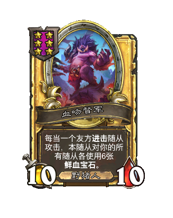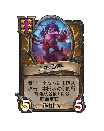 - 改动后:5/5。每当一个友方进击随从攻击,本随从对你的所有随从各使用3张鲜血宝石。